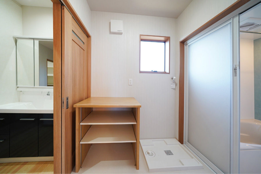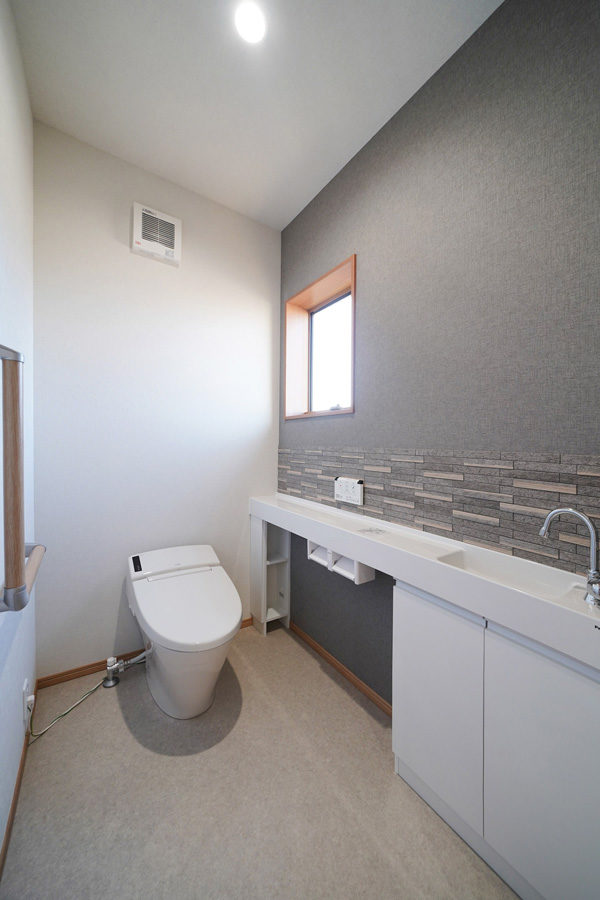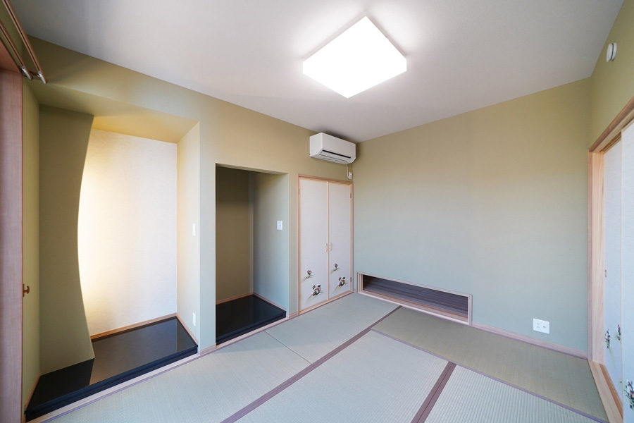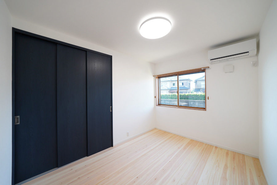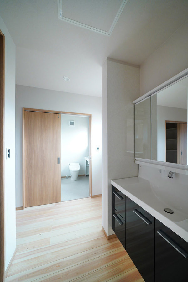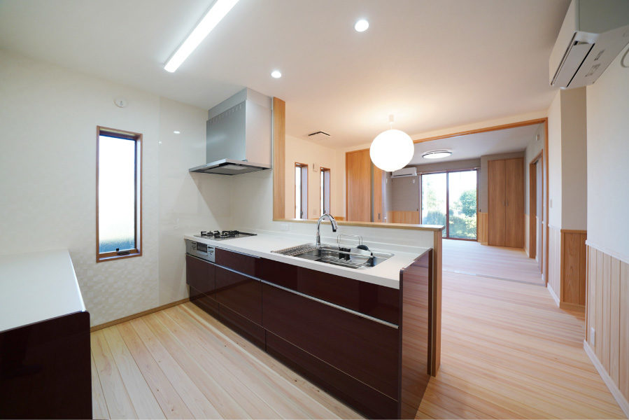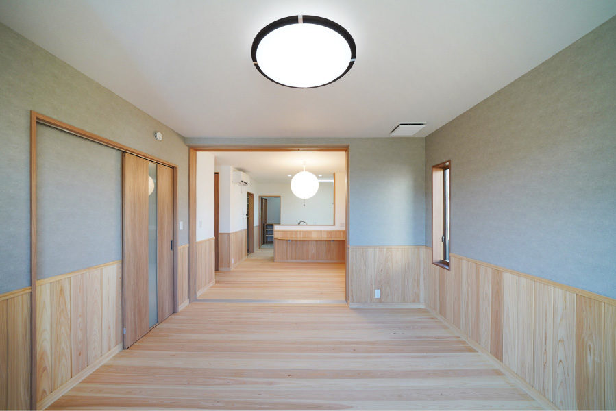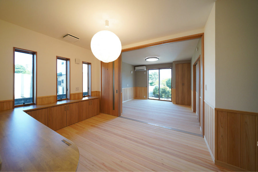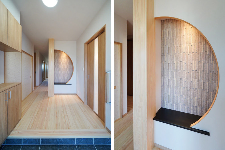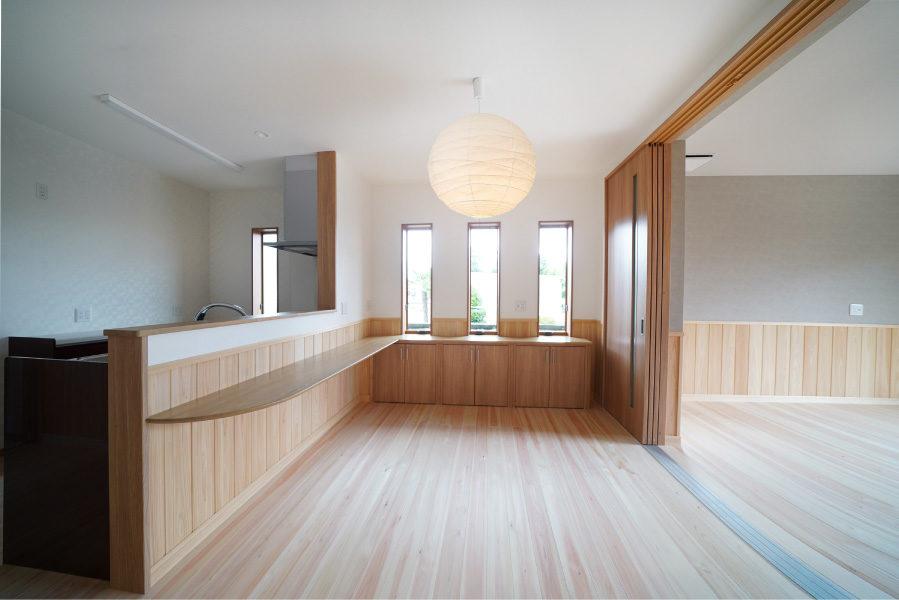 広々とした玄関ポーチには暮らしにゆとりを与える深い軒を設え、玄関を入ると檜7寸角の大黒柱と美しい飾り棚がお出迎えしてくれます。檜の腰壁と床のLDKは優しい檜の香りと温もりに包まれた寛げる空間です。また快適な生活動線、用途に合わせたゆとりの収納なども必見。