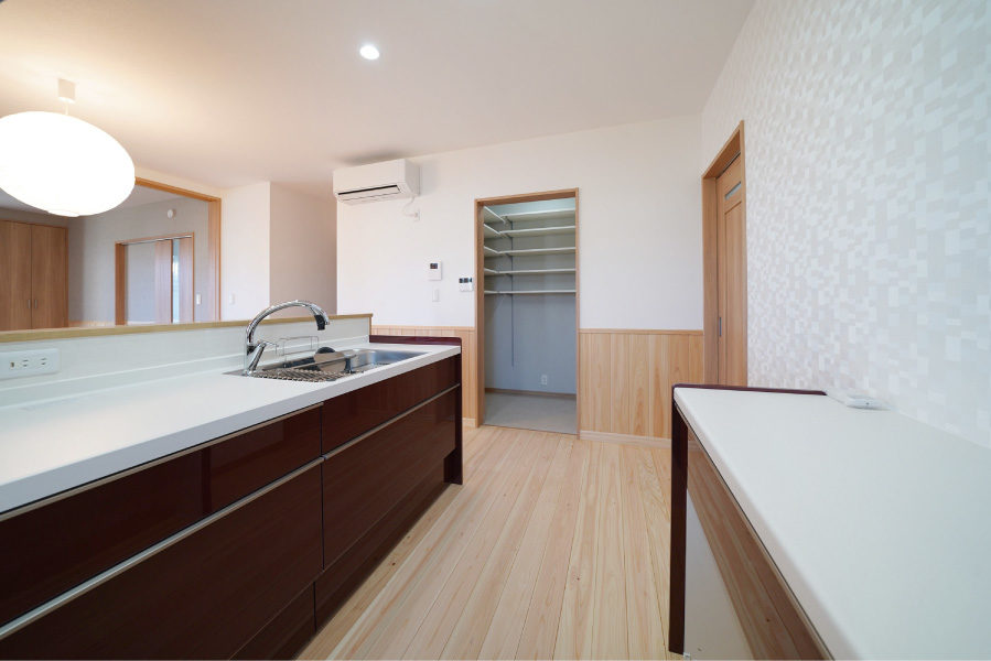 対面式キッチンは造作のカウンターとたっぷりの収納棚を設置しました。