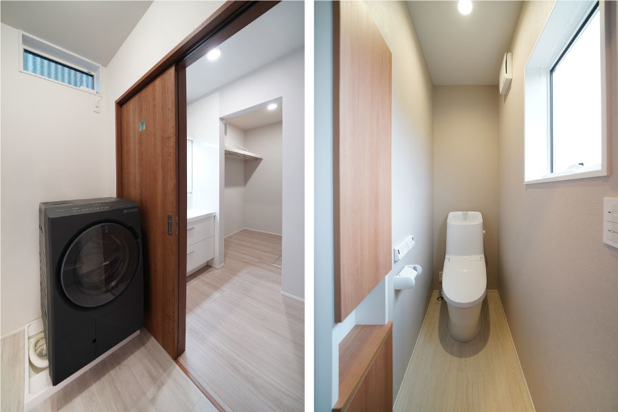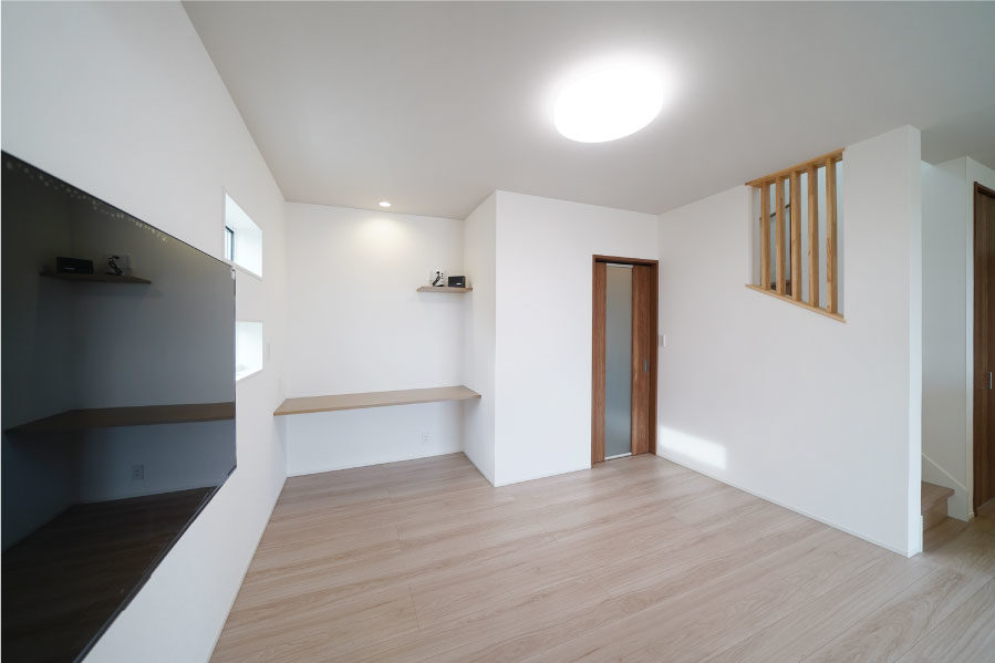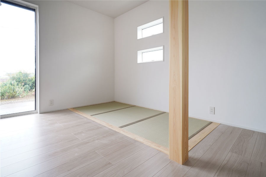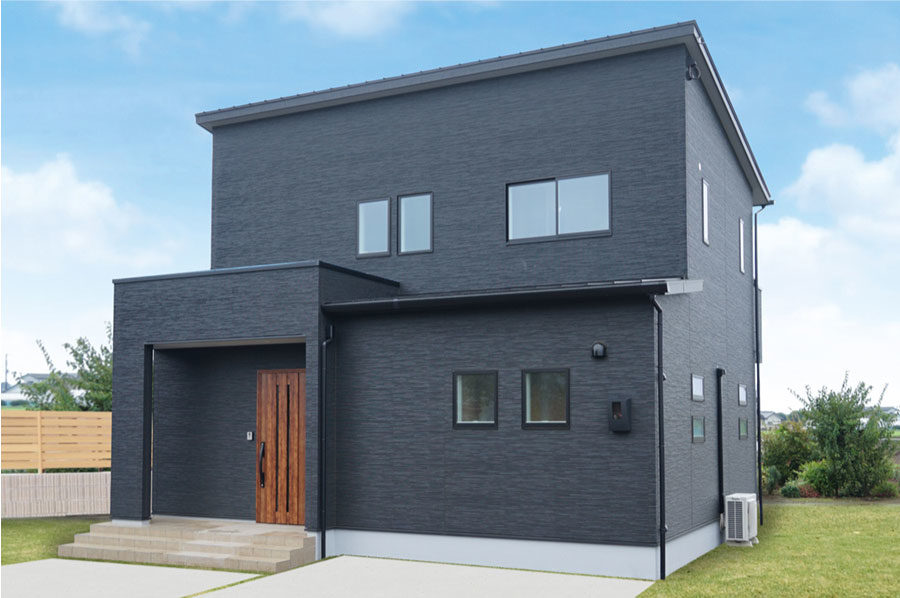 黒の外壁と木製玄関ドアが調和する外観。LDKには、お洗濯物を畳んだりお昼寝できるタタミコーナーやお子様が勉強できるスタディコーナーなど家族みんなが集まり楽しく過ごせる工夫が盛り沢山!