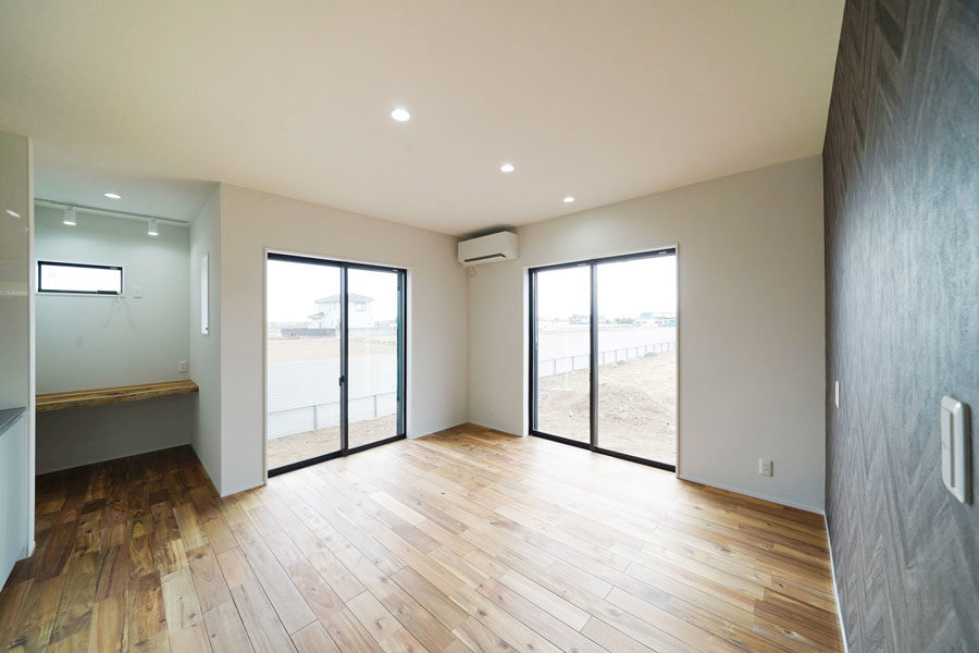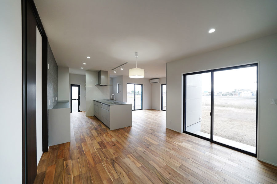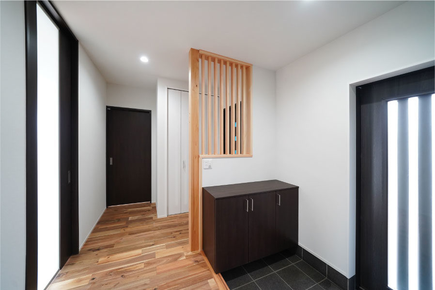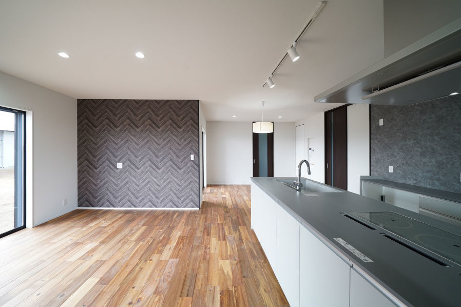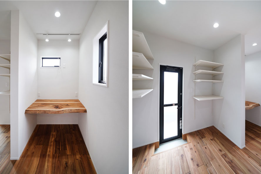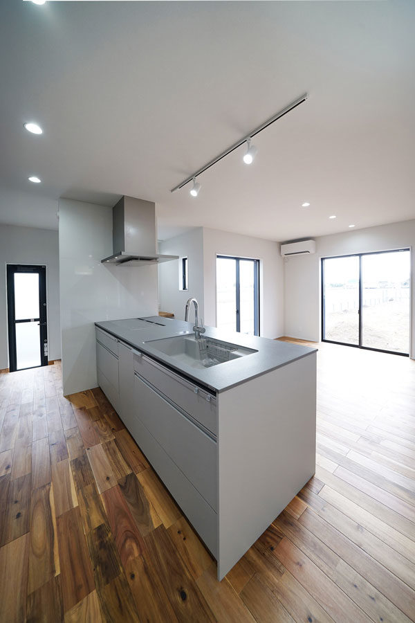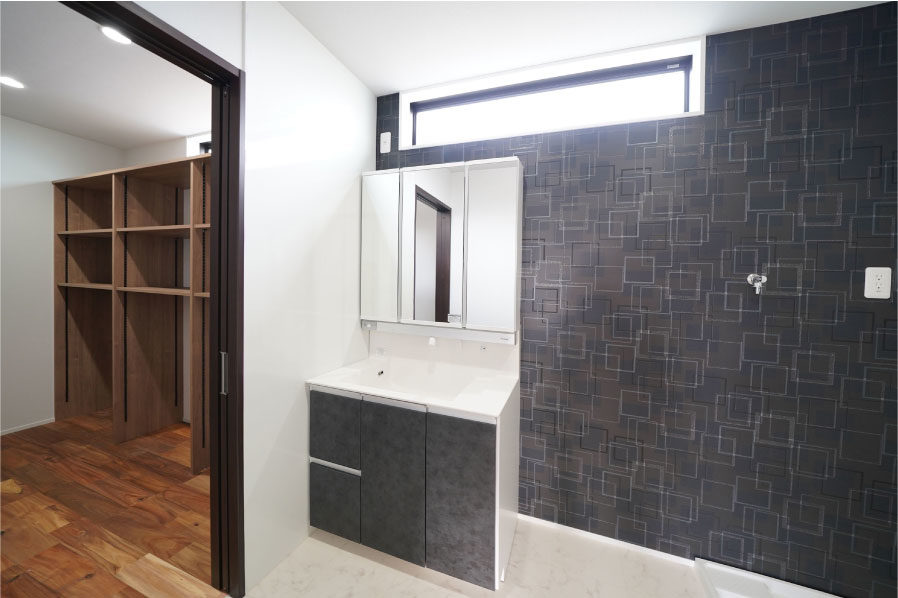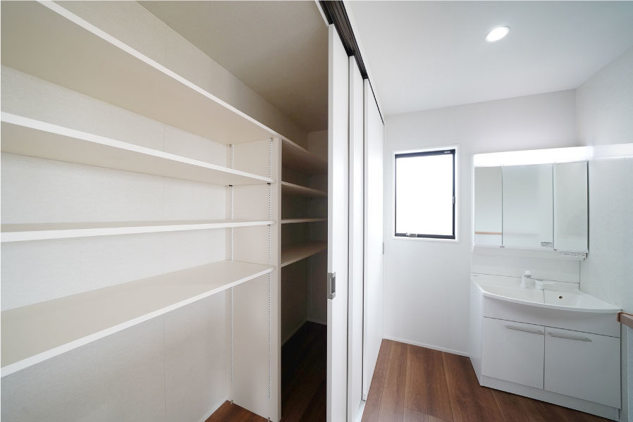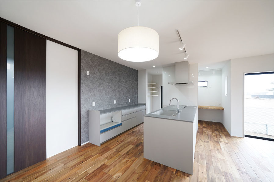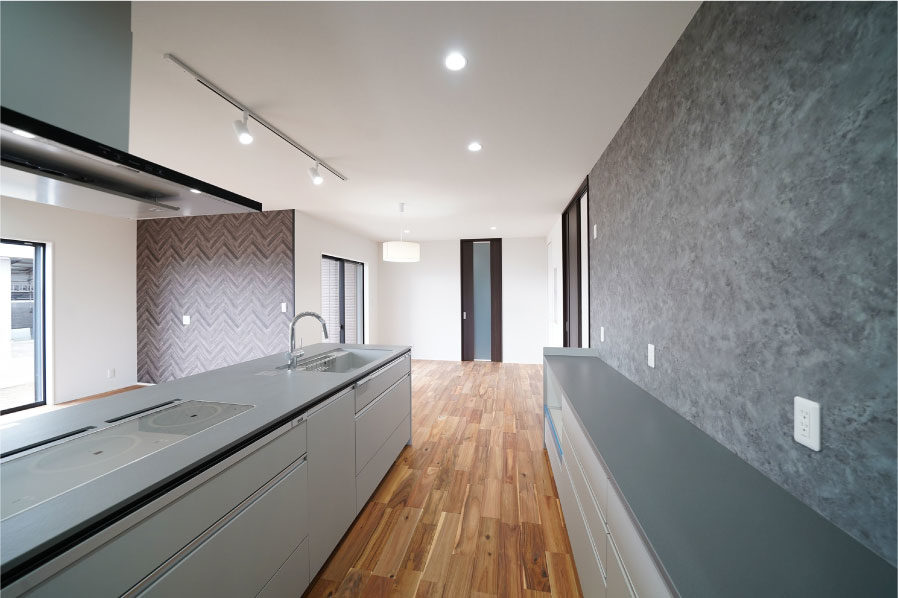 ペニンシュラキッチンを中心に、パントリー、造作デスクスペース、リビング・ダイニングが回廊のようになっている家事楽動線。帰宅時はファミリークロークから洗面室に直行できます。洗練されたデザインと機能性どちらも叶えたお住まいです。