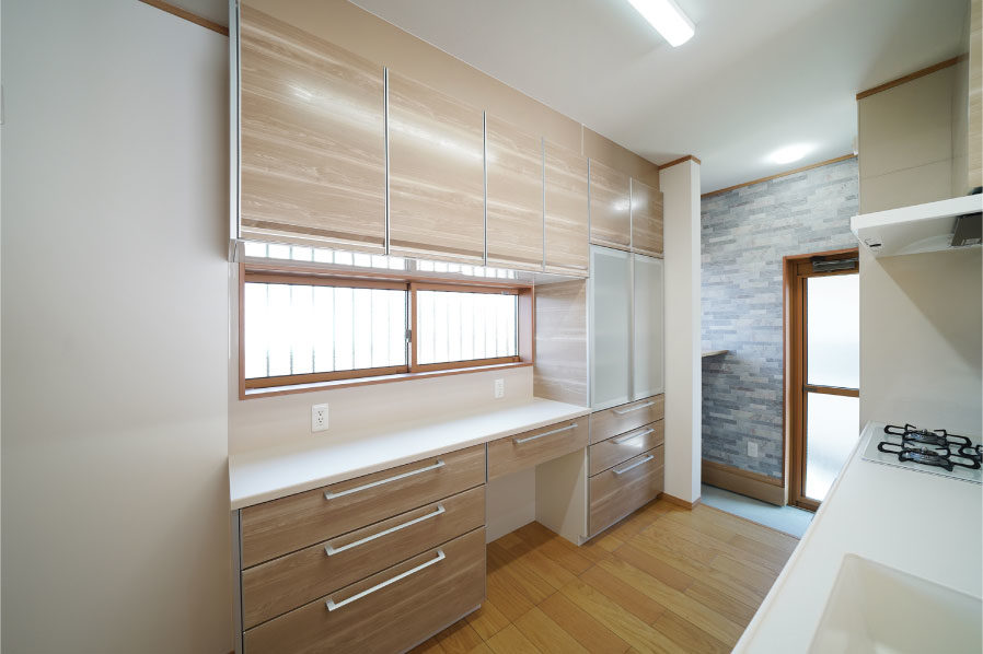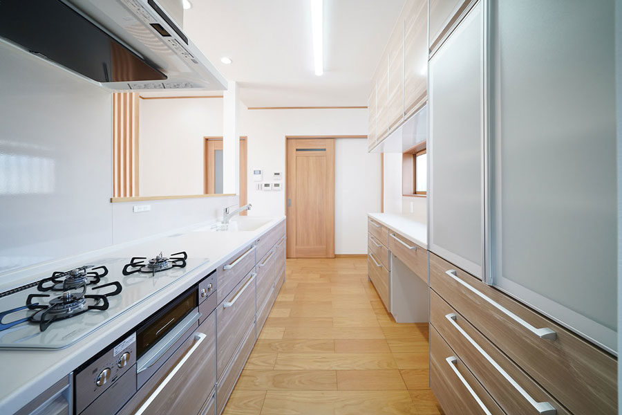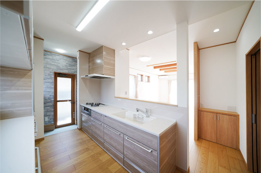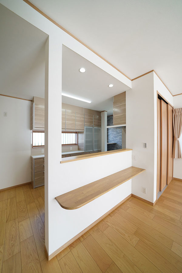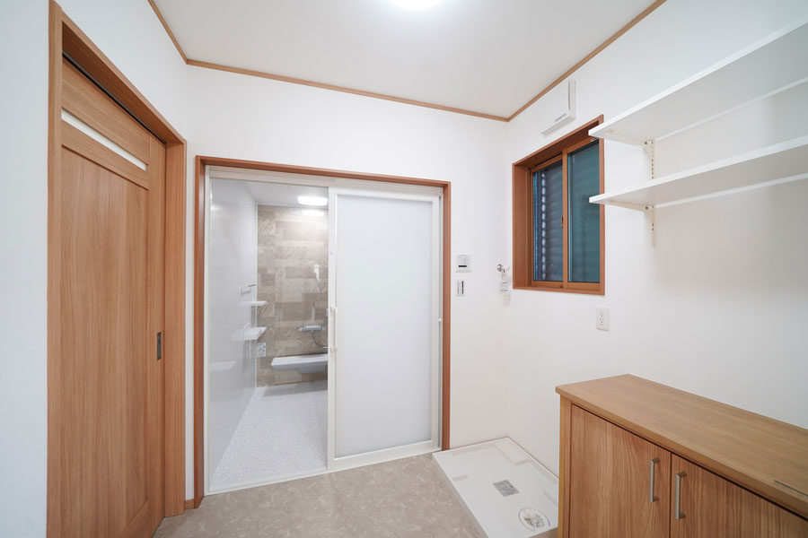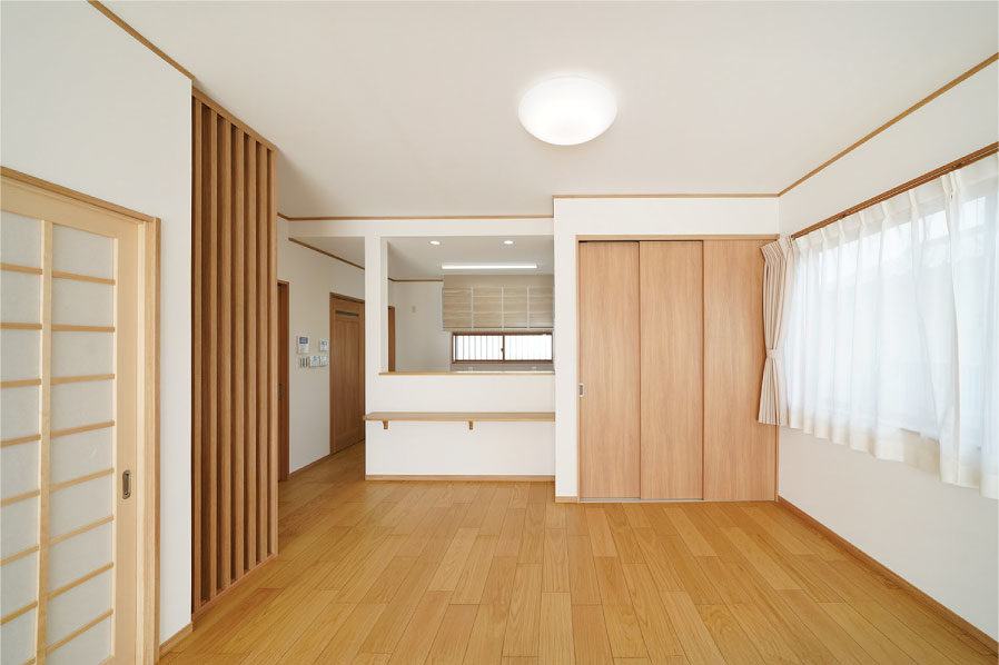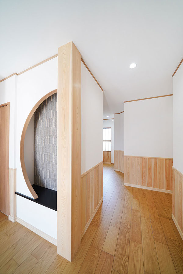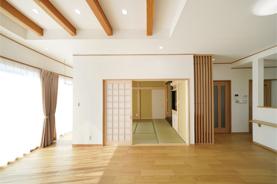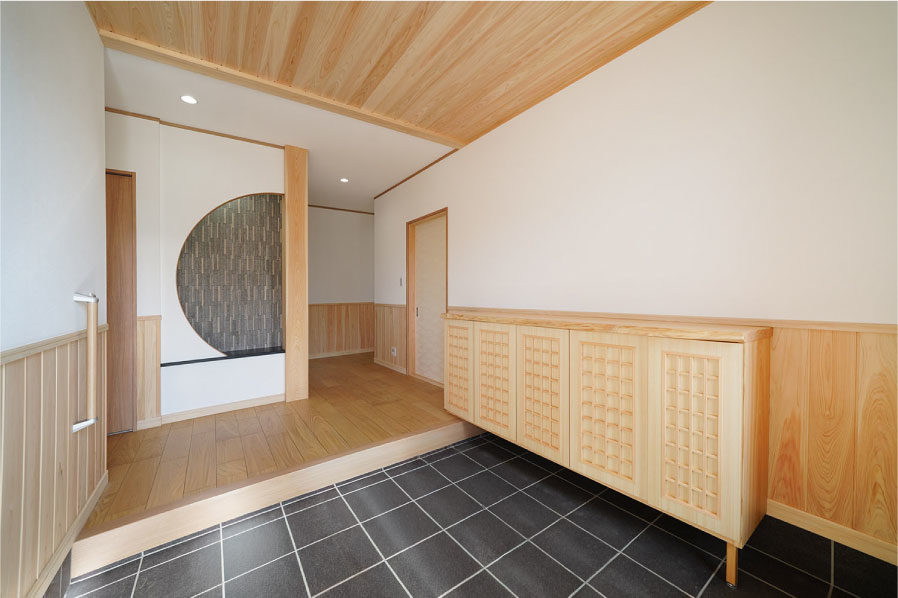 7寸角の大黒柱とこだわりの造作下駄箱のある広々玄関。本格和室と続き間となっているLDKは冬暖かく夏涼しくすごせる快適空間。玄関スロープや水まわり、生活動線などバリアフリーにも配慮しています。