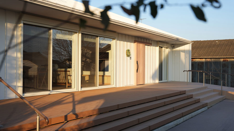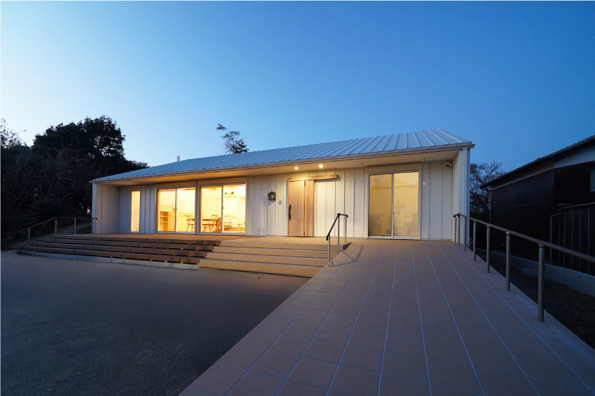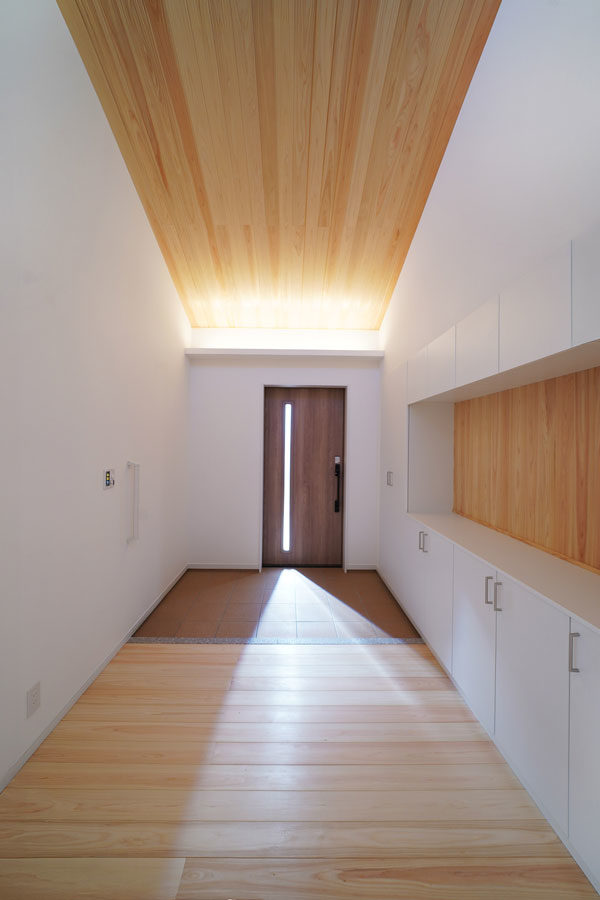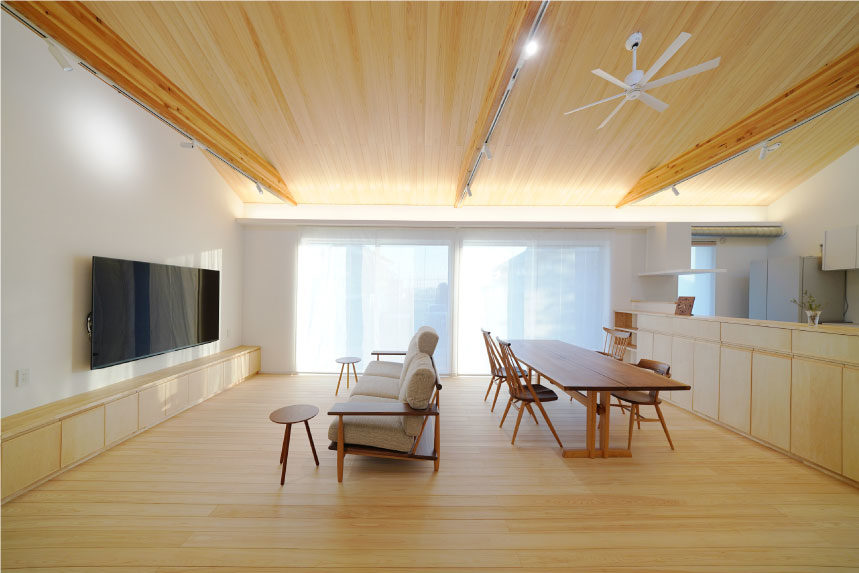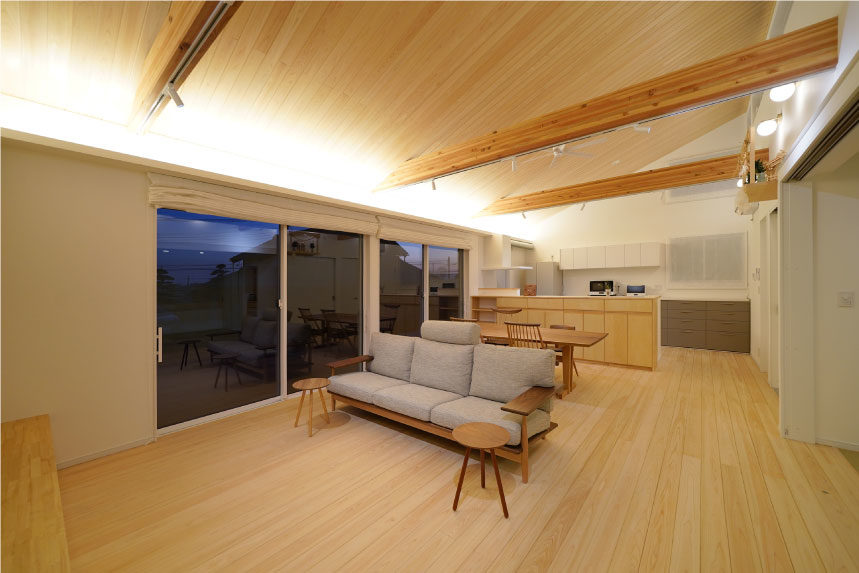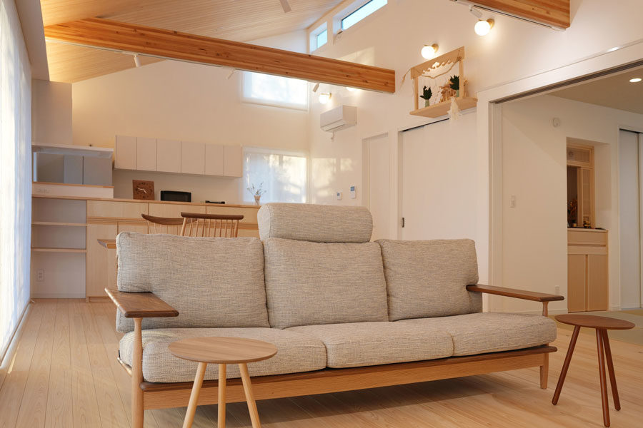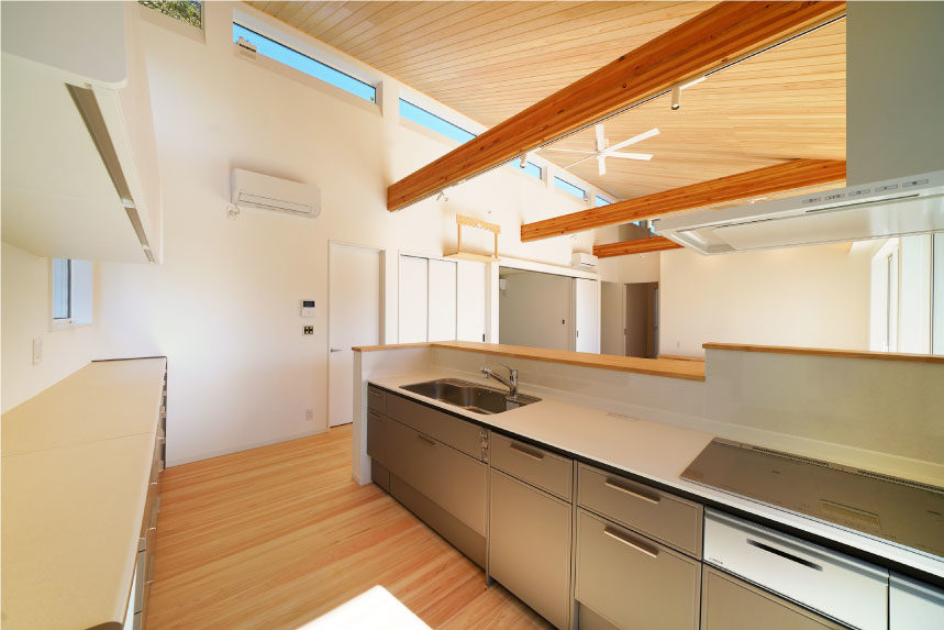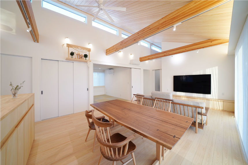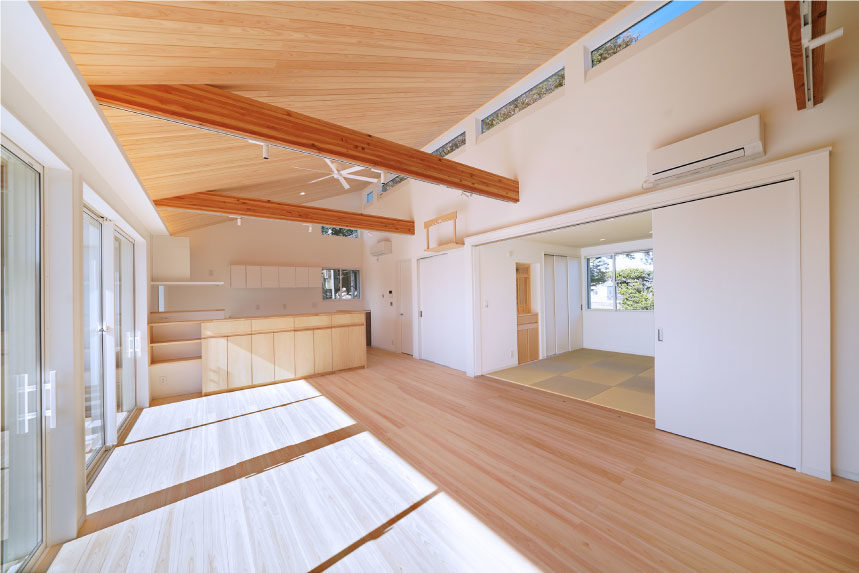 青空に映えるおしゃれな白い外観と開放感あふれる勾配天井のLDK。南側の大きな開口は冬になると太陽の恵みを届けてくれ夏になるとそよ風を呼び込み北側の高窓が温まった空気を逃がしてくれる。四季を愉しみながら暮らせる住まい。