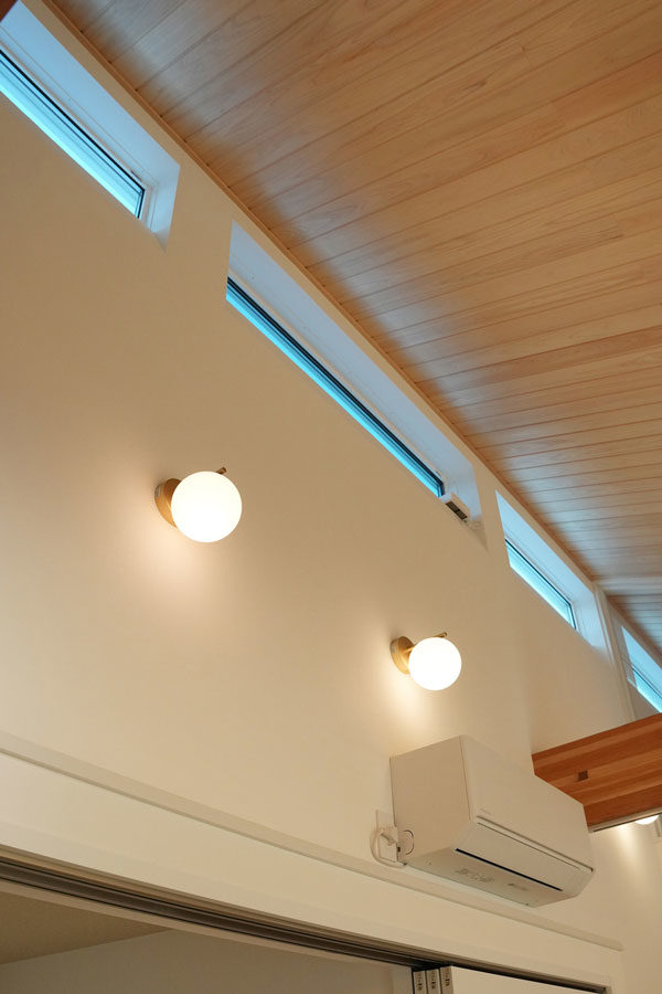 高窓の窓枠を斜めにカットしました。LDKから見上げた時に外の風景の邪魔をしない配慮です。